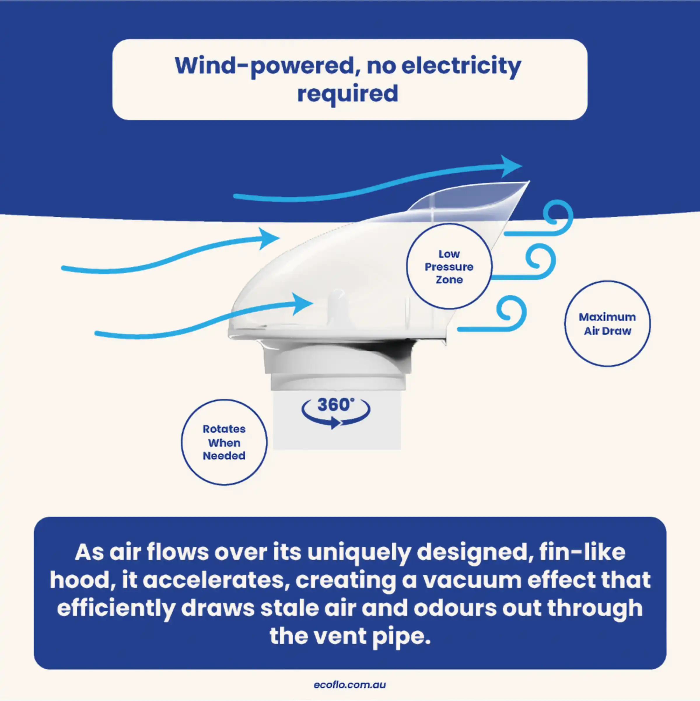 The SharkVent harnesses the natural power of the wind. As air flows over its uniquely designed, fin-like hood, it accelerates, creating a low-pressure zone that efficiently draws stale air and odours out through the vent pipe.
